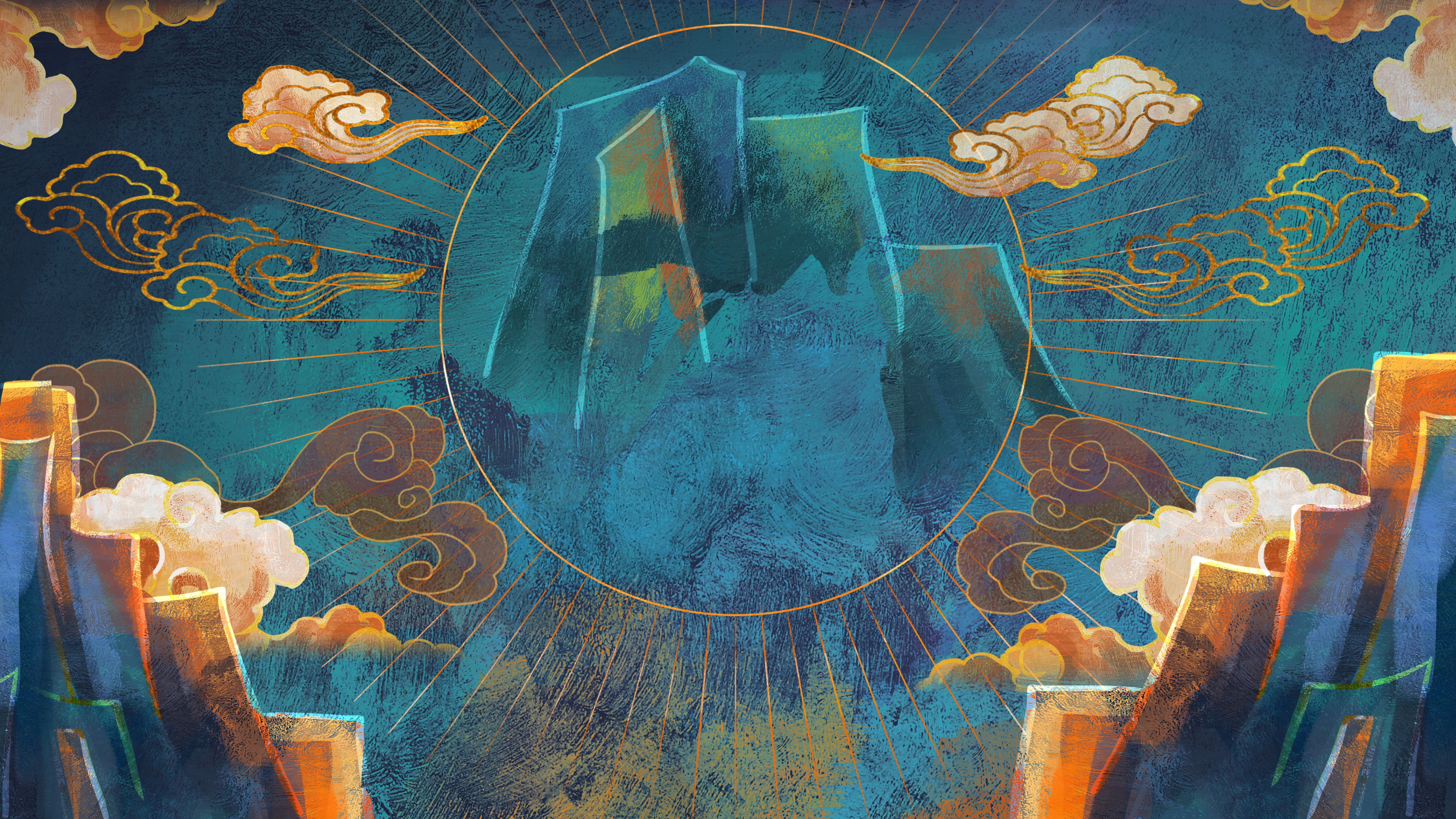 Chinese style, trendy, Dunhuang rock painting, mythological landscape, auspicious clouds, sun illustration, poster background, PSD design material.